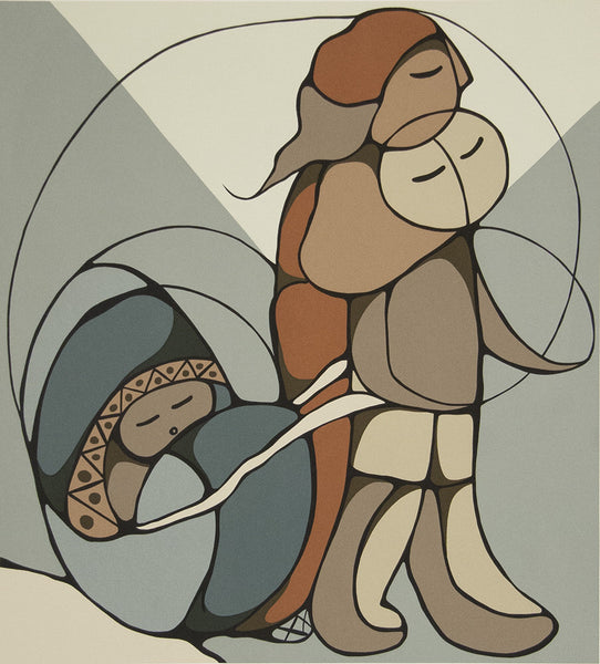 Odjig had painted for most of the years of her life, but it was in the 1960's that she began to exhibit a deliberately Native perspective in her work and, like her grandfather, felt compelled to try to instruct the young about their heritage. To do so, she began to focus her art-making upon the legends, joys and realities of aboriginal life, while simultaneously refining her signature style of utilizing clear colours, soft, curving contours enclosed in black outlining, transparency and overlapping of shapes and modernist, abstracted figuration.