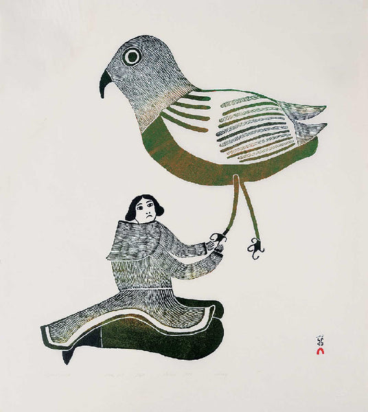 "Lucy Quinnuayuak is a prolific graphic artist, well known for illustrations of her favorite theme - the bird image, either singularly or in groups, and in all sorts of situations or relationships. She also depicts other themes which spring from her personal interpretation of the Canadian Inuit traditional way of life. She was born in Salluit, in northen Quebec. At a very young age Qinnuayuak, along with her mother and sister, moved to Baffin Island, where they lived in Cape Dorset and in several outpost camps. She met her husband, Tikituk, a sculptor and graphic artist, at Supujuak camp where they enjoyed a traditional way of life. In the early 1960s they moved to Cape Dorset.