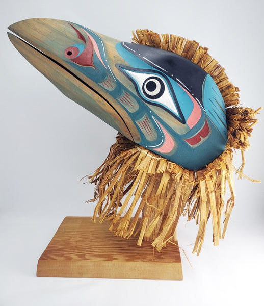Traditionally, cedar was the most important component of embellishing dance masks. There is an old technique, handed down through generations of sustainably harvesting cedar bark strips for masks and regalia. Quinn has been taught how to properly do this by elders and has often harvested his own cedar bark for his artworks.