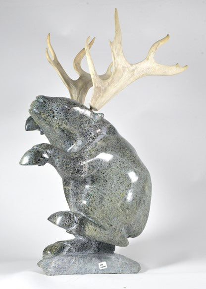 Sii Ashoona is a fourth generation artist was born into the Ashoona family. Born in 1967, Sii grew up in Kinnigait (Cape Dorset, NU) alongside Shuvinai Ashoona, Goota Ashoona and Napachie Ashoona. Sculpting with soap stone, and bone, Sii takes inspiration from traditional themes to create his work.