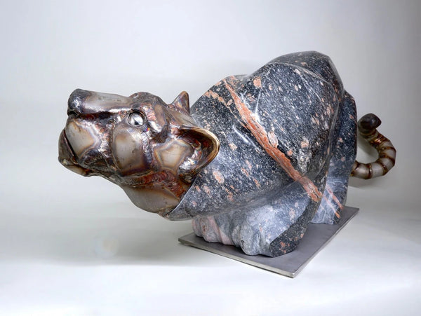 Since 2007, Tobias has been a professional in the field, teaching himself to weld, carve stone and wood, and work with clay. He primarily works with hard rock such as granite or basalt and stainless steel. Equally comfortable creating monumental pieces as well as more intimate objects, all of his sculptures are one of a kind. The process involves welding and carving, with no casting. The works displayed range from functional pieces to large-scale public sculptures.
