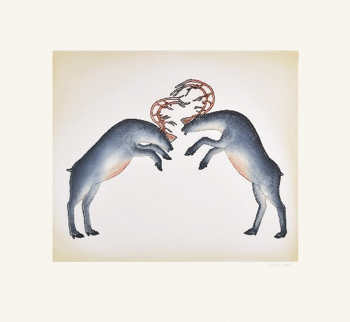 In 1977, Pitseolak travelled to Holman Island to introduce lithography to the resident printers there. Although he stopped carving briefly in 1991 to build his own house, Pitseolak quickly resumed making art and continued to develop as a versatile, prolific and talented artist. His sculpture is often relatively large in size, highly polished and displays flowing forms and exquisite detail. His subject matter ranges from fanciful birds to sensitive portrayals of mothers with children. His own graphic work was included in two previous collections, 1992 and 1994. The Cape Dorset community lost Pisteolak last year at the age of 68.